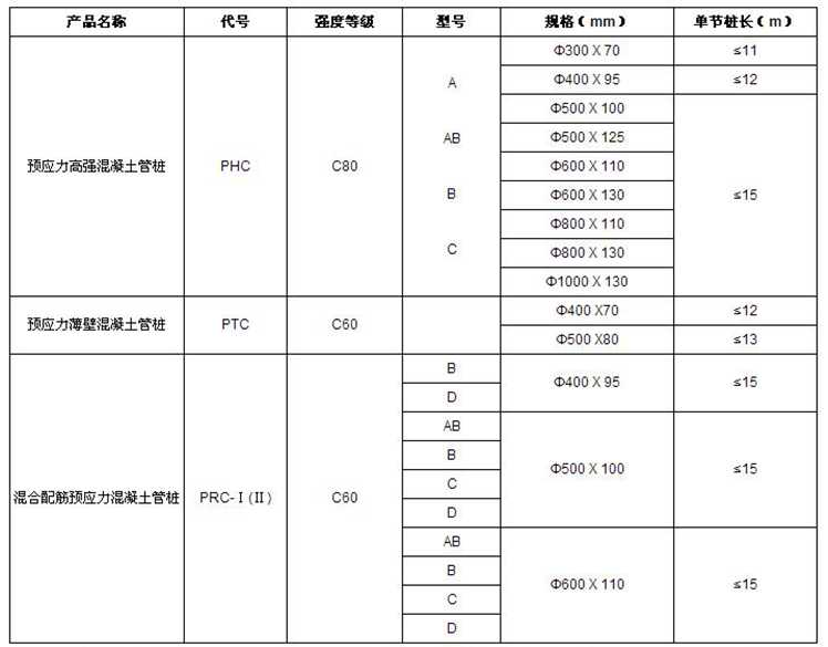 業(yè)臻管樁集團生產(chǎn)各類預應力混凝土管樁,直徑范圍300mm-1000mm,管樁壁厚度一般在70mm至130mm,長度主要在5m至15m之間。業(yè)臻管樁生產(chǎn)的預應力混凝土管樁(PHC)、預應力薄壁管樁(PTC)、以及混合配筋預應力混凝土管樁(PRC-Ⅰ(Ⅱ)),可滿足客戶不同項目所在區(qū)域的環(huán)境與地質(zhì)狀況需求。